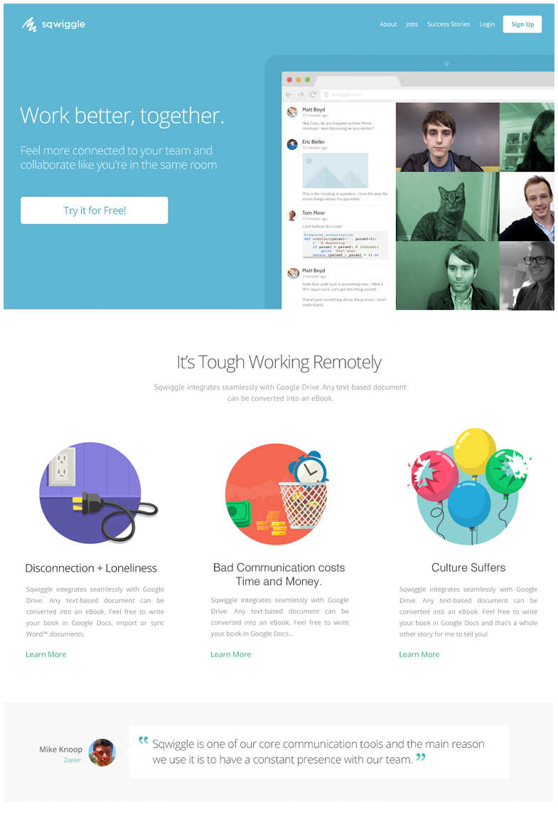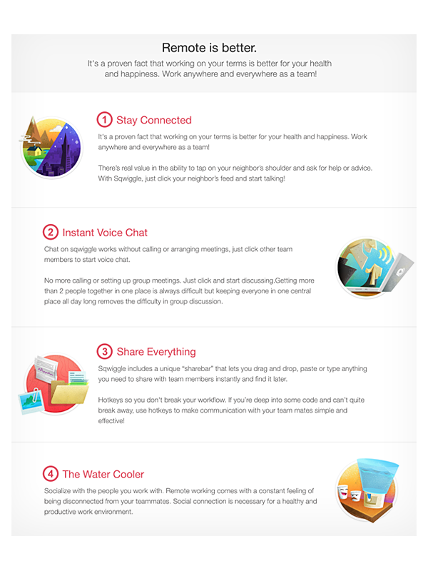 I was a designer for the visual identity of Sqwiggle, creating icons, illustrations, and marketing materials. Sqwiggle is an always-on online workplace for your remote team to work together throughout the day and feel more connected.