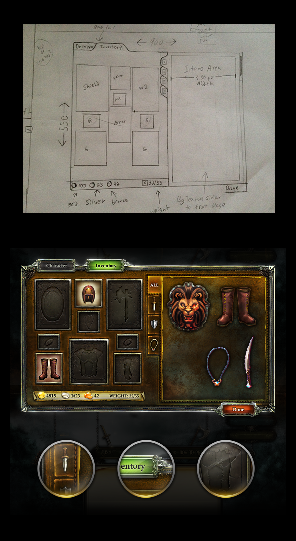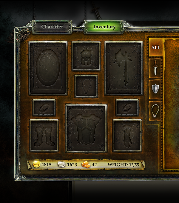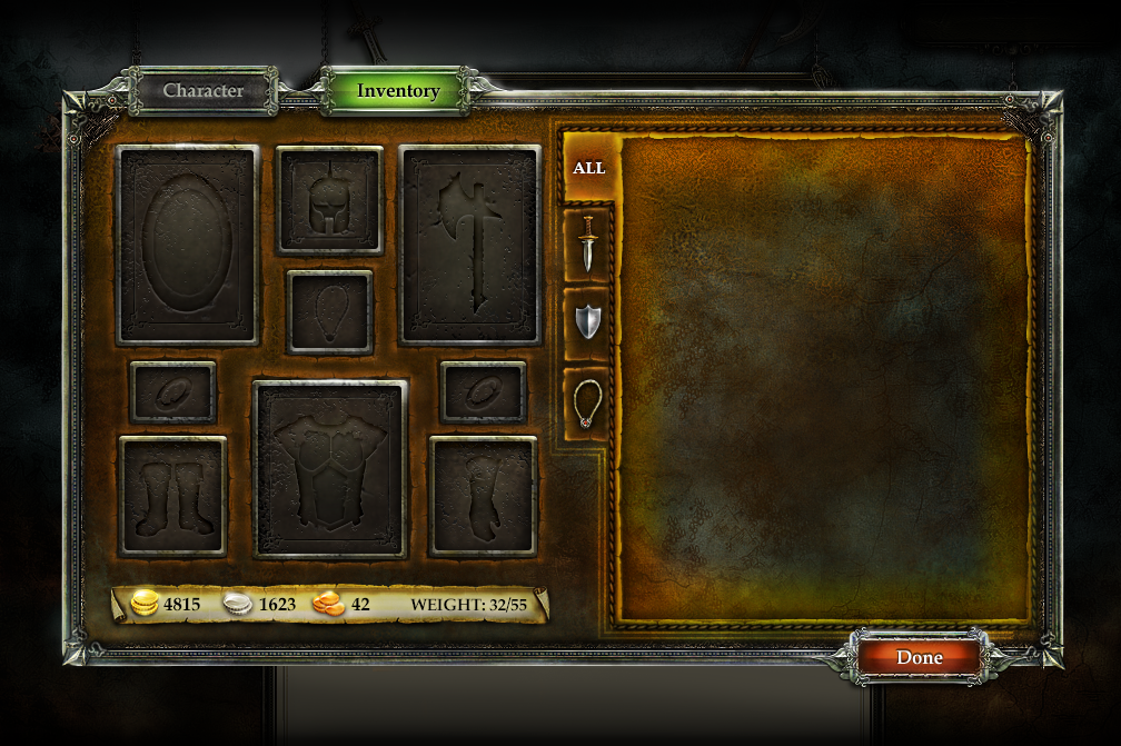 I worked to design a new interface and visual style for a medieval web game concept. The initial exploration included the item inventory and equipment popup as well as inventory item look and feel.
